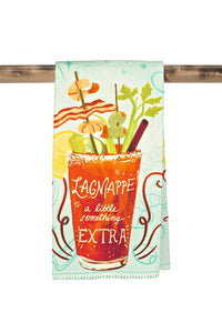 A colorful tea towel featuring out Lagniappe design. The artwork features a Bloody Mary cocktail with the words “Lagniappe A Little Something Extra” on the glass with a blue background.