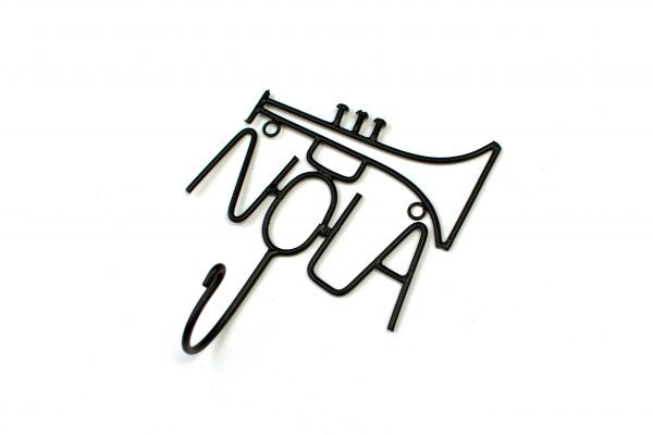 A sturdy black metal decorative wall hook in the shape of the word Nola, which is a short nickname for New Orleans, Louisiana.